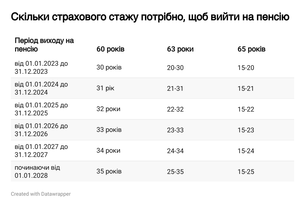 Щодо виходу на пенсію, то для чоловіків та жінок це можливо після настання 60 років. Але щоб вийти на заслужений відпочинок у 60, треба мати не менше 30 років страхового стажу. Страховий стаж — це кількість років, коли ви (або за вас) платили єдиний соцвнесок. І цей стаж з кожним роком стає більшим: до 2028 року він становитиме 35 років.