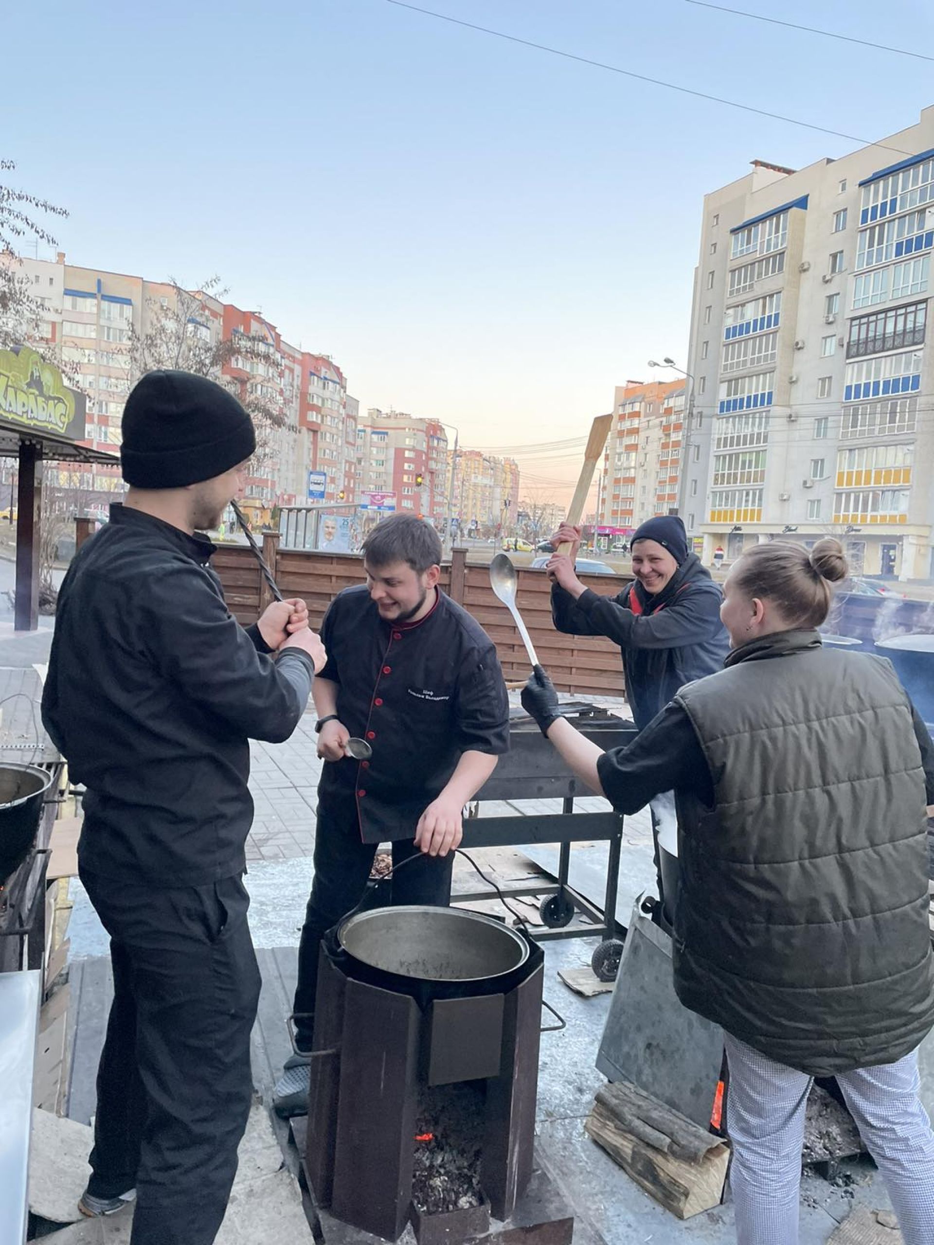– У перший день ми ще не до кінця розуміли, що відбувається, але вирішили, що безвідповідально просто сидіти. До мене зателефонував наш су-шеф Ваня Мельник, сказав: давай щось робити. Ми за кілька годин обдзвонили всіх працівників, хто був у місті, запропонували попрацювати, відгукнулися практично всі. – розповідає управляючий мережі ресторанів Віталій Гайдук. – У перший день прийшло дуже багато наших співробітників. Менеджери чистили картоплю, бармени мили посуд, офіціанти готували суд. Всі робили все.