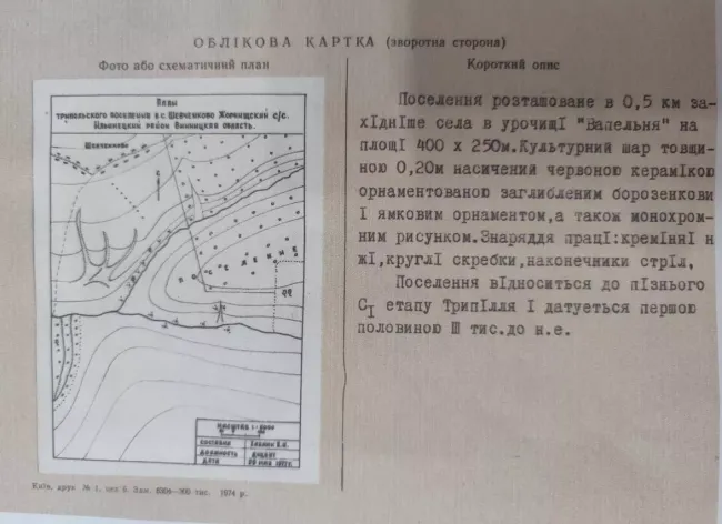 За її словами, в урочищі «Вапельня» неодноразово знаходили фрагменти кераміки, які свідчать про існування тут трипільського поселення. Підтвердженням цьому є і довідка управління містобудування та архітектури облдержадміністрації, де зазначено, що ця територія має статус пам’ятки археології.