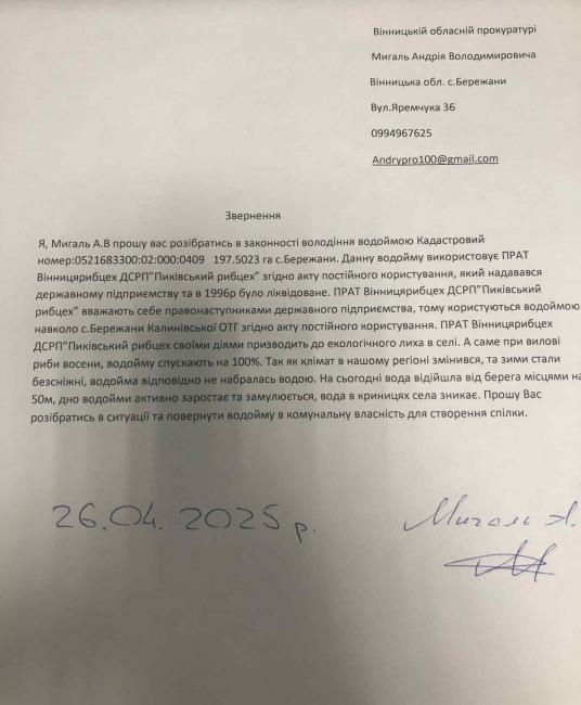 Житель Бережан Андрій Мигаль вже подав офіційне звернення до Вінницької обласної прокуратури, у якому просить: