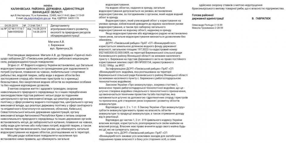 — ДСРП «Пиківський рибцех» ПрАТ «Вінницярибгосп» користується земельною ділянкою водного фонду державної власності загальною площею 197,5023 гектара (кадастровий номер 0521683300:02:000:0409), розташованою на території Бережанської сільської ради Калинівського району Вінницької області, за межами населеного пункту села Бережани. Право постійного користування землею підтверджено Державним актом серії І-ВН №000154, зареєстрованим 15 лютого 1996 року за №07, — зазначив у відповіді голова районної державної адміністрації Володимир Гаврилюк.