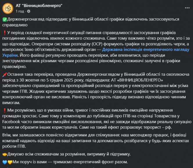 Компанія наголошує, що в умовах війни та емоційного напруження багато критичних коментарів у соцмережах можуть не відображати реальну ситуацію. «ВІННИЦЯОБЛЕНЕРГО» залишається відкритим для спілкування і закликає громадян звертатися до месенджера компанії для отримання відповідей та роз'яснень щодо роботи графіків.