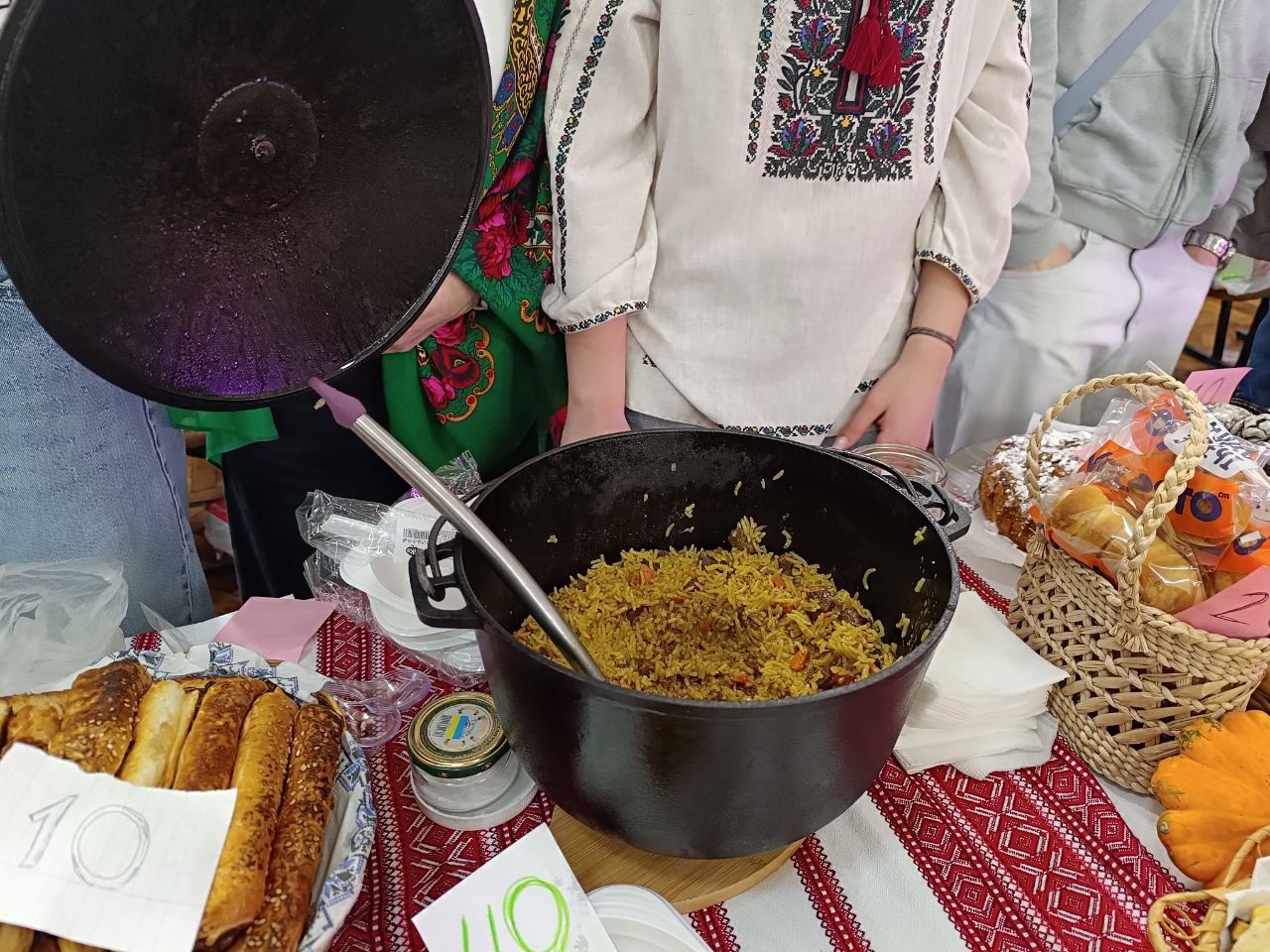 — Нам дуже сподобалася ця ініціатива, бо вона об’єднує. Батьки й діти старалися, дуже готувалися. На нашому столі є плов, роли, млинці — усе зроблено власноруч. До того ж деякі страви передавалися з різних міст. Учора ми зустрічалися, а сьогодні підігрівали їх для ярмарку, — розповідає Ірина, мама одного зі студентів радіотехнічного відділення. — Для нас це дуже важливо, і ми щиро вдячні всім нашим воїнам за те, що вони дають нам можливість жити.