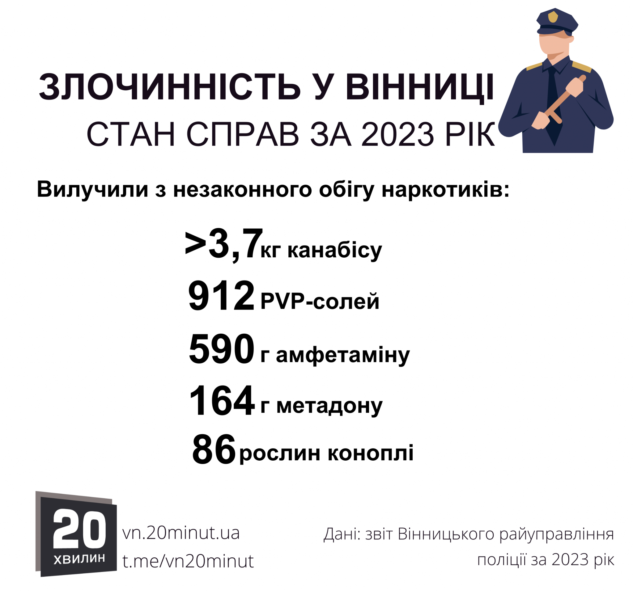 «Так, загалом працівниками поліції Вінницького райвідділку за 2023 рік на території Вінницької громади з незаконного обігу було вилучено понад 3,7 кілограма канабісу, 912 грамів PVP-солей (синтетичних психотропних речовин), 590 грамів амфетаміну, 164 грами метадону та 86 незаконно вирощуваних рослин коноплі», — йдеться у звіті.