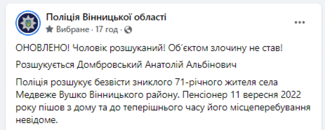 - Поліція розшукує Анатолія Домбровського. Його бачили в селі Грижинці Гніванської громади.