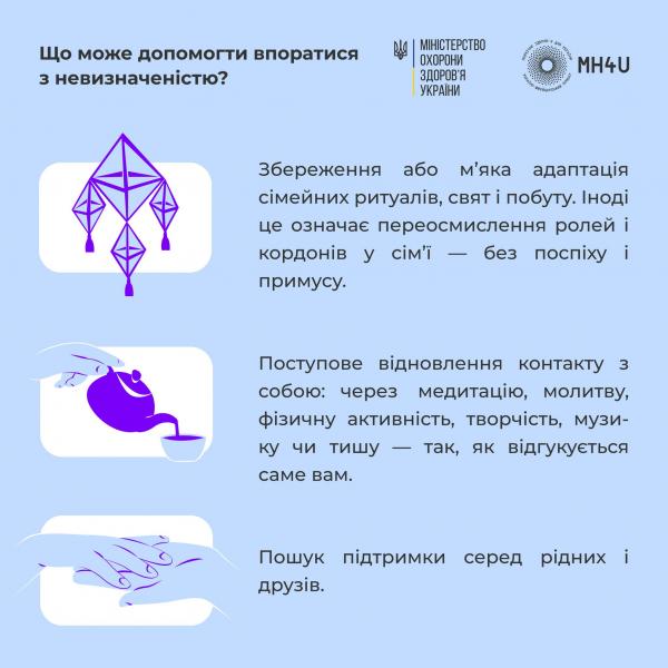 - Дбати про себе щодня: сон, збалансоване харчування, фізична активність, невеликі радощі та моменти відпочинку.