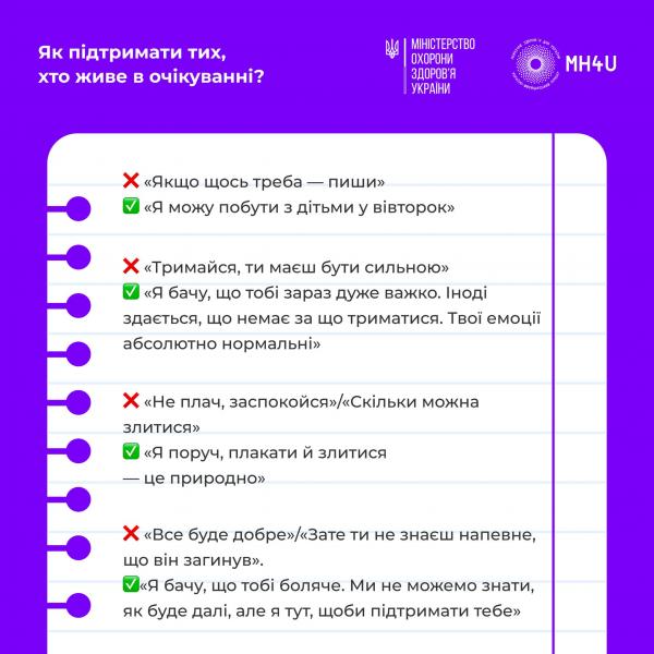 Міністерство охорони здоров’я України та ініціатива «Психічне здоров’я для України» пояснюють, що такі родини живуть у стані невизначеної втрати. Постійне очікування тягне за собою тривогу, зміну настрою, фізичне виснаження та складність у плануванні повсякденного життя.
