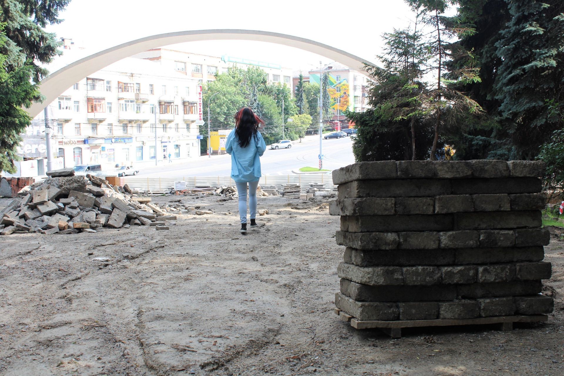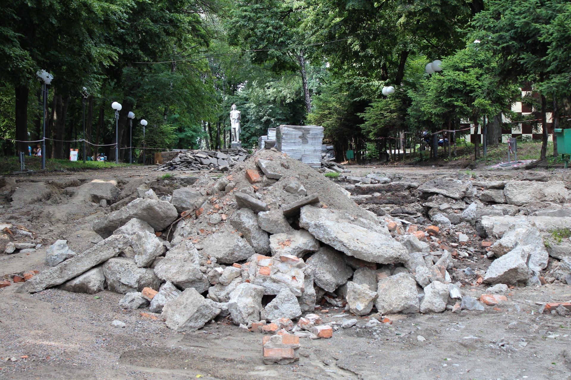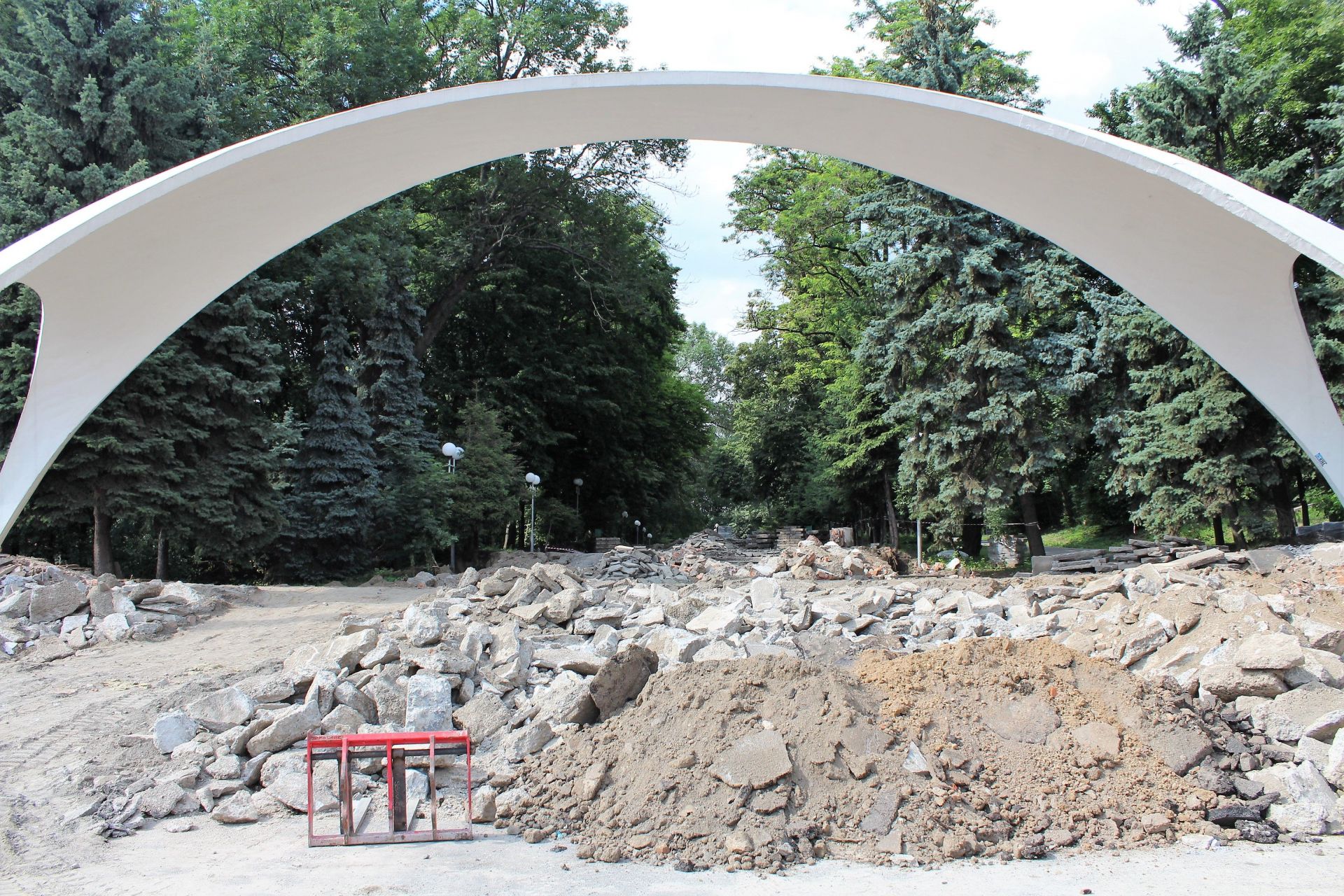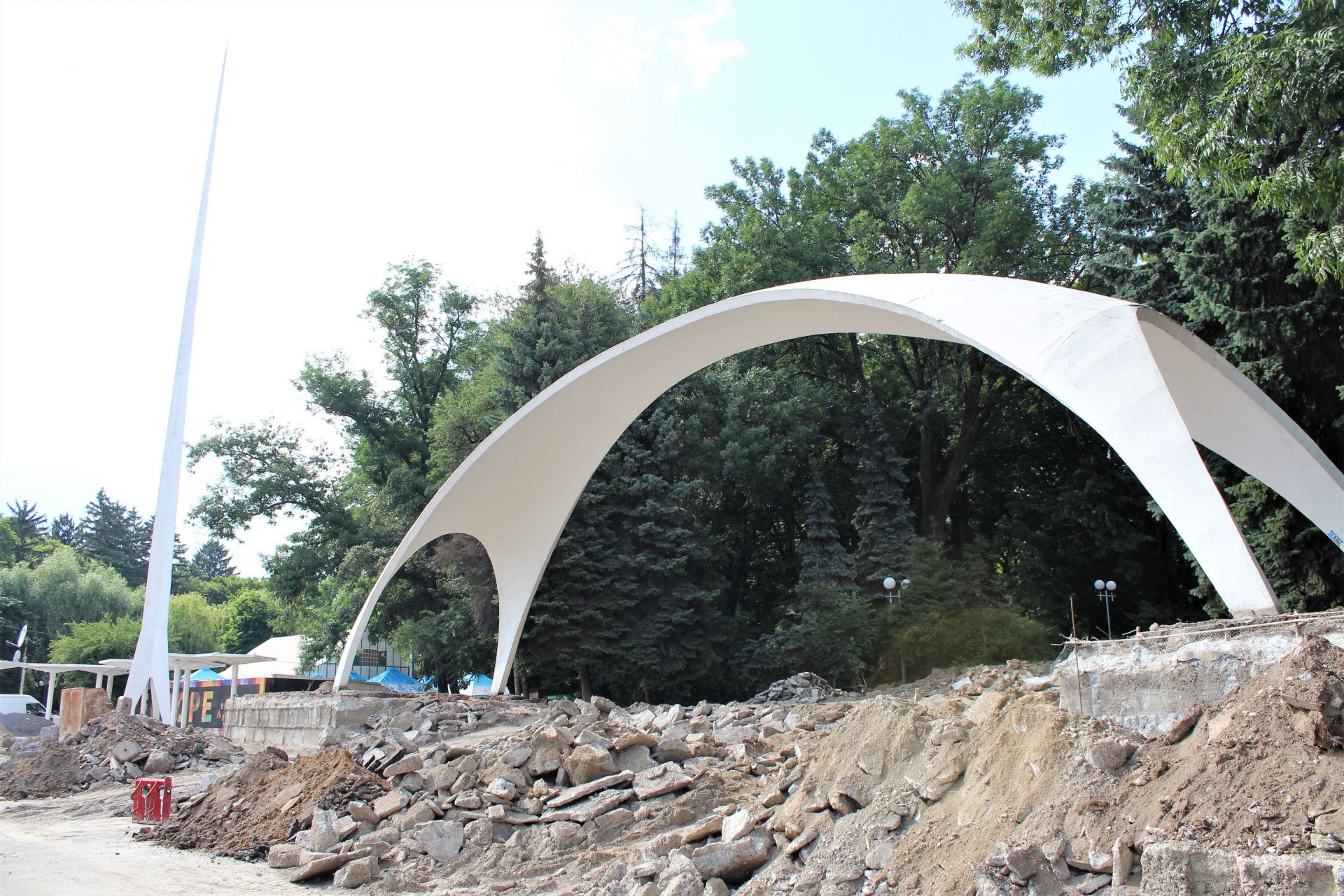 Цього літа почали оновлювати головний вхід в Центральний парк. За два тижні робітники зняли стару плитку, облицювання основи під Арку, демонтували сходи. І як розповів один з будівельників — наразі готують Арку, Шпиль та «грибочки» до ремонту.