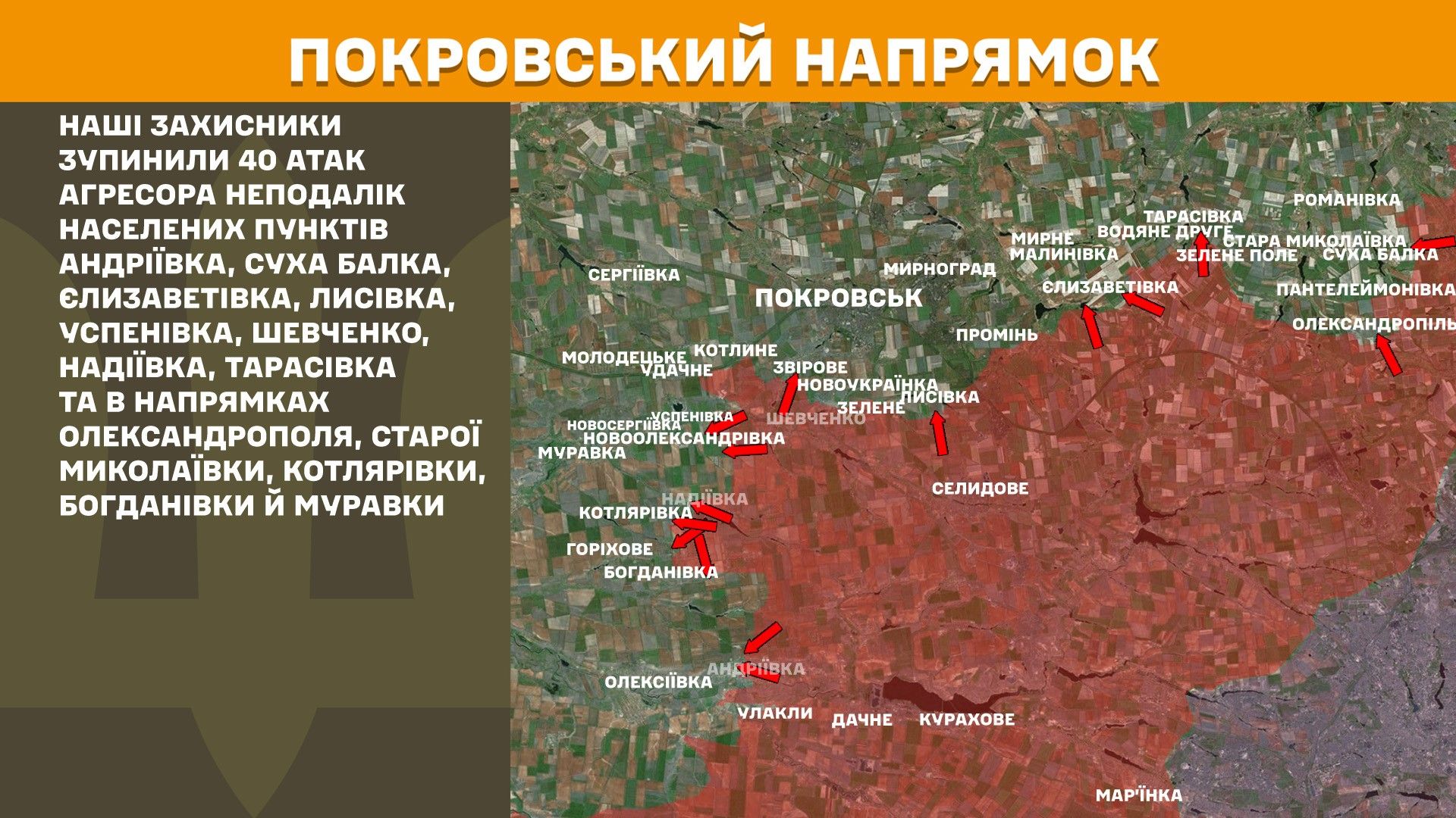 На Покровському напрямку наші захисники зупинили 40 атак агресора неподалік населених пунктів Андріївка, Суха Балка, Єлизаветівка, Лисівка, Успенівка, Шевченко, Надіївка, Тарасівка та в напрямках Олександрополя, Старої Миколаївки, Котлярівки, Богданівки й Муравки.