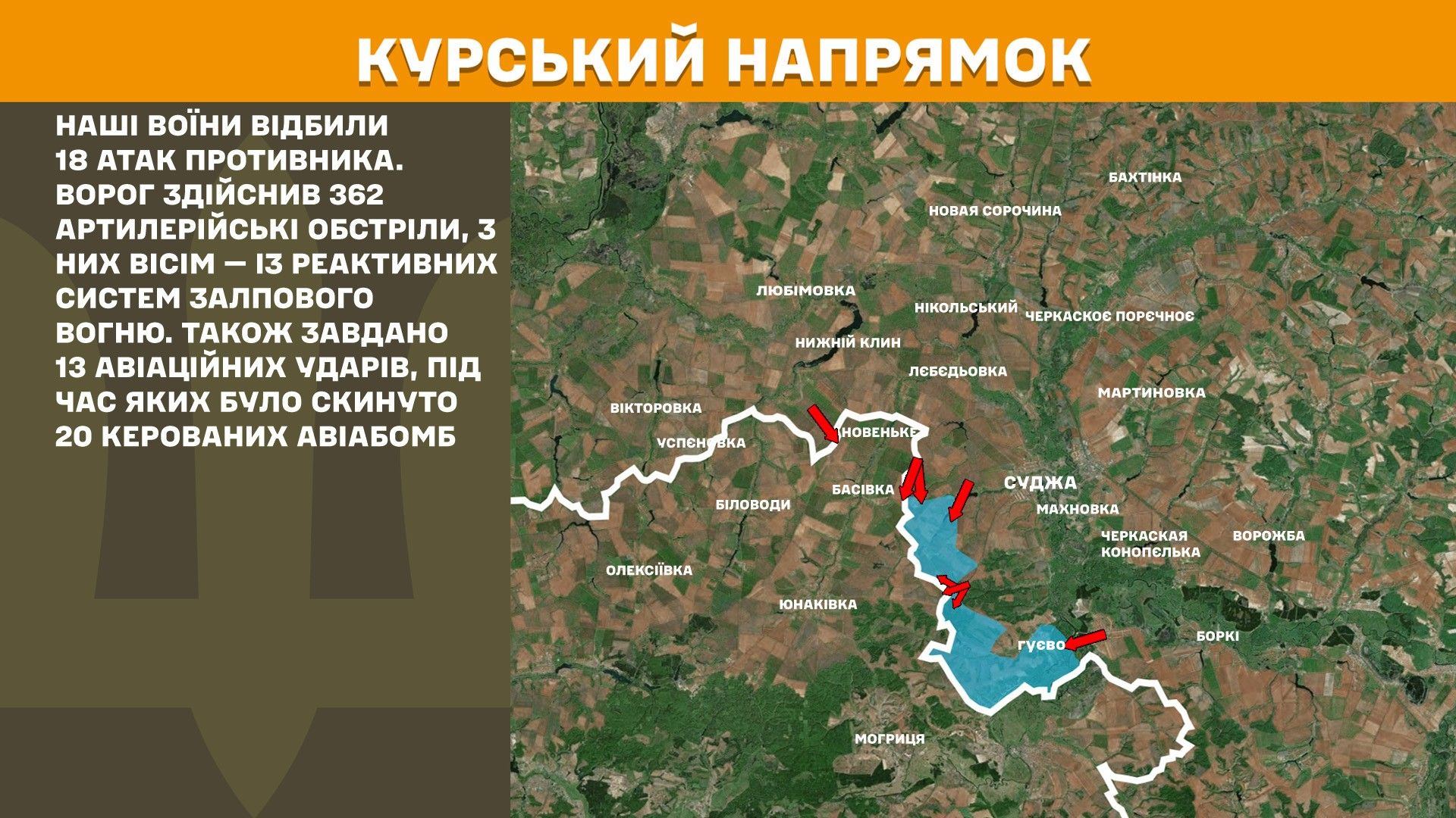 На Курському напрямку минулої доби наші воїни відбили 18 атак противника. Ворог здійснив 362 артилерійські обстріли, з них вісім — із реактивних систем залпового вогню. Також завдано 13 авіаційних ударів, під час яких було скинуто 20 керованих авіабомб.