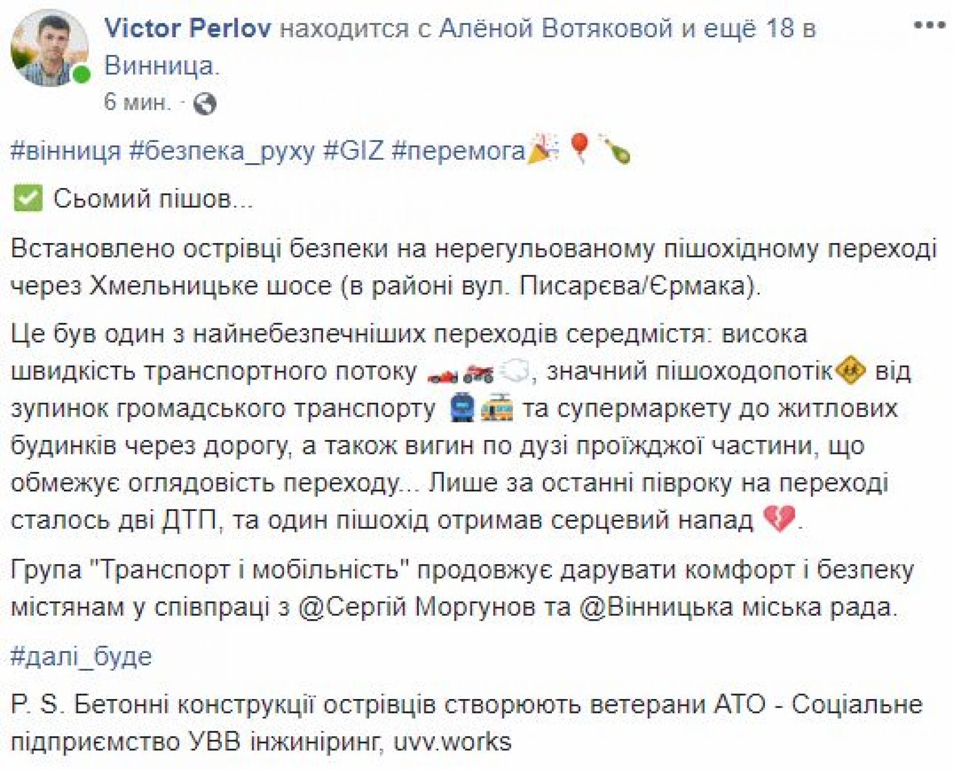 «Це був один із найнебезпечніших переходів середмістя: висока швидкість транспортного потоку, значний пішоходопотік від зупинок громадського транспорту та супермаркету до житлових будинків через дорогу, а також вигин по дузі проїжджої частини, що обмежує оглядовість переходу, — пише Перлов. — Лише за останні півроку на переході сталось дві ДТП, та один пішохід отримав серцевий напад».