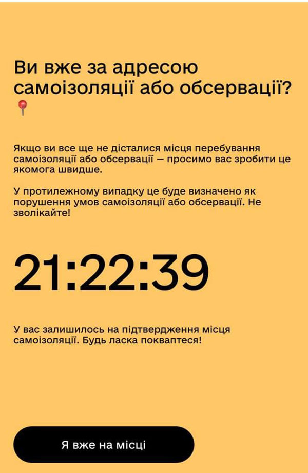 Після цього додаток попросить надати доступ до вашої геолокації та підтвердити місце самоізоляції, вказавши точну адресу, де ви перебуватимете у цей час.