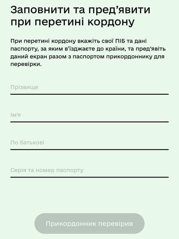 Далі ввести прізвище, ім’я, по батькові, а також серію та номер паспорту. Ці дані мають бути перевірені прикордонною службою.