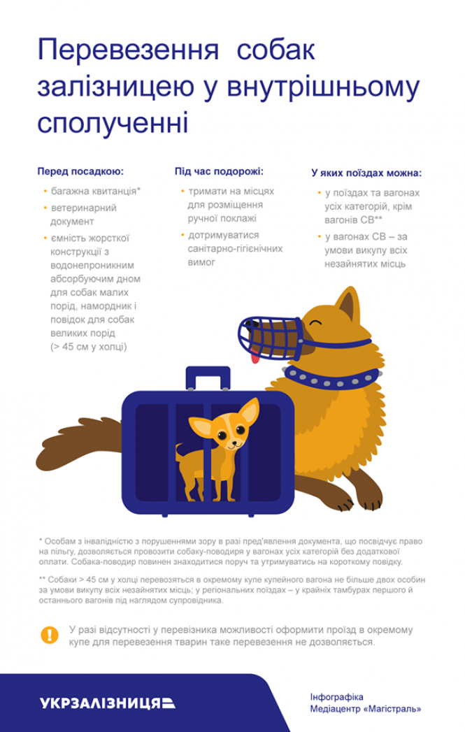Для подорожі з домашнім улюбленцем залізничним транспортом у межах України необхідно мати багажну квитанцію і чинне ветеринарне свідоцтво. Для собак, котів та птахів правила різняться.