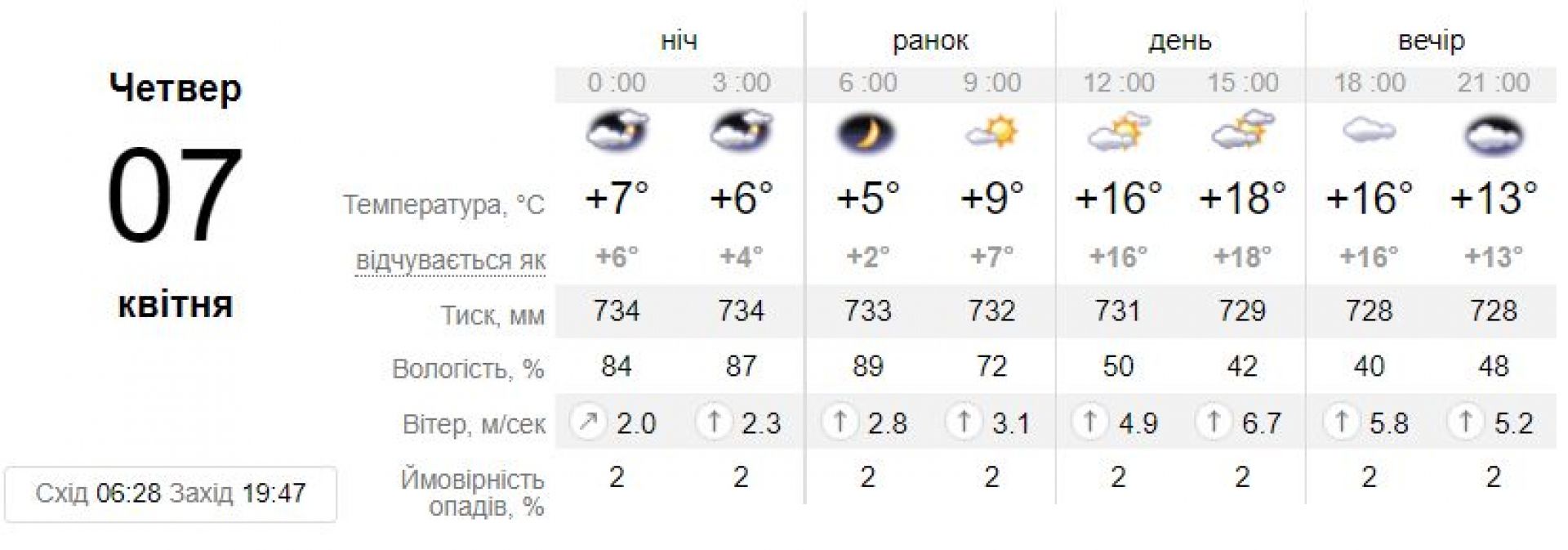 — 7-го квітня протягом дня максимальна температура повітря у більшості наших областей становитиме +14+20 градусів, — пише синоптик у фейсбук. — Трохи свіжіше буде на узбережжі морів та в Карпатах, +9+12 градусів. У четвер буде багато сонця, хіба західні області прикриє хмарами.
