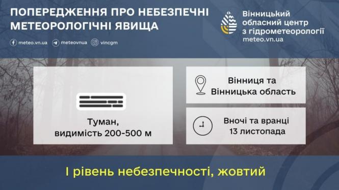 За прогнозом Вінницького Гідрометцентру, у четвер, 13 листопада, у Вінниці та області буде хмарно, але без сильних опадів. Головна небезпека — туман, особливо вночі та вранці, коли видимість впаде до 200–500 метрів. Це жовтий рівень небезпеки, тож водії, будьте особливо обережні.