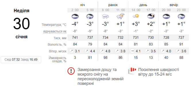 Сайт sinoptik.ua у Вінниці на 30 січня прогнозує ожеледицю та пориви вітру до 15-24 м/с. Температура буде у межах -4+3. Йтиме мокрий сніг.