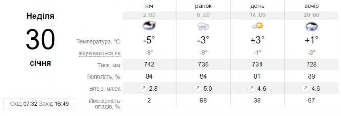 На 30 січня також передають мокрий сніг. Цього дня трохи роз'ясниться і вигляне сонце.