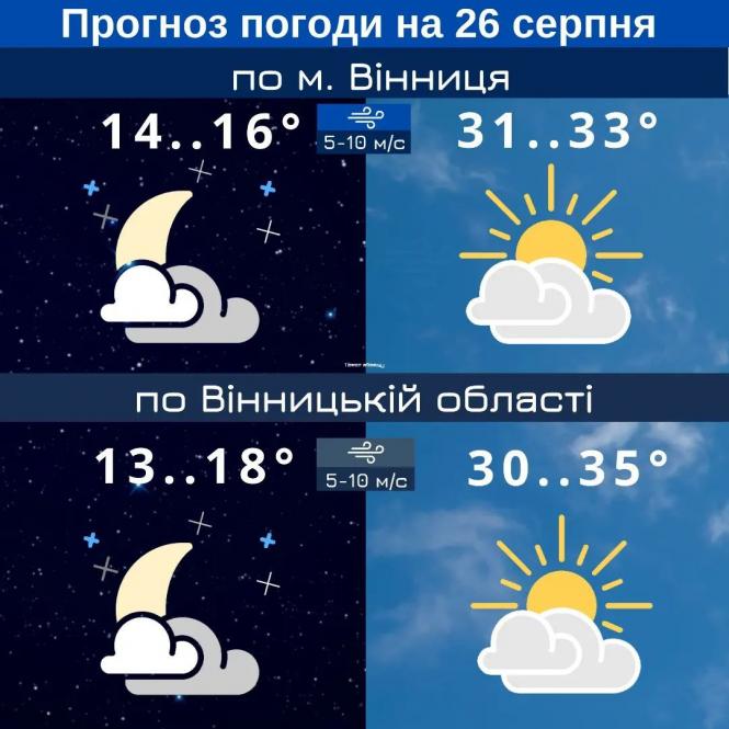 На суботу, 26 серпня, передають мінливу хмарність без опадів. Вітер південний, 5-10 м/с. Температура вночі 13-18°, вдень 30-35°.