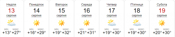 - 19 серпня: без опадів. Температура вночі 14-20°, вдень 26-32°.