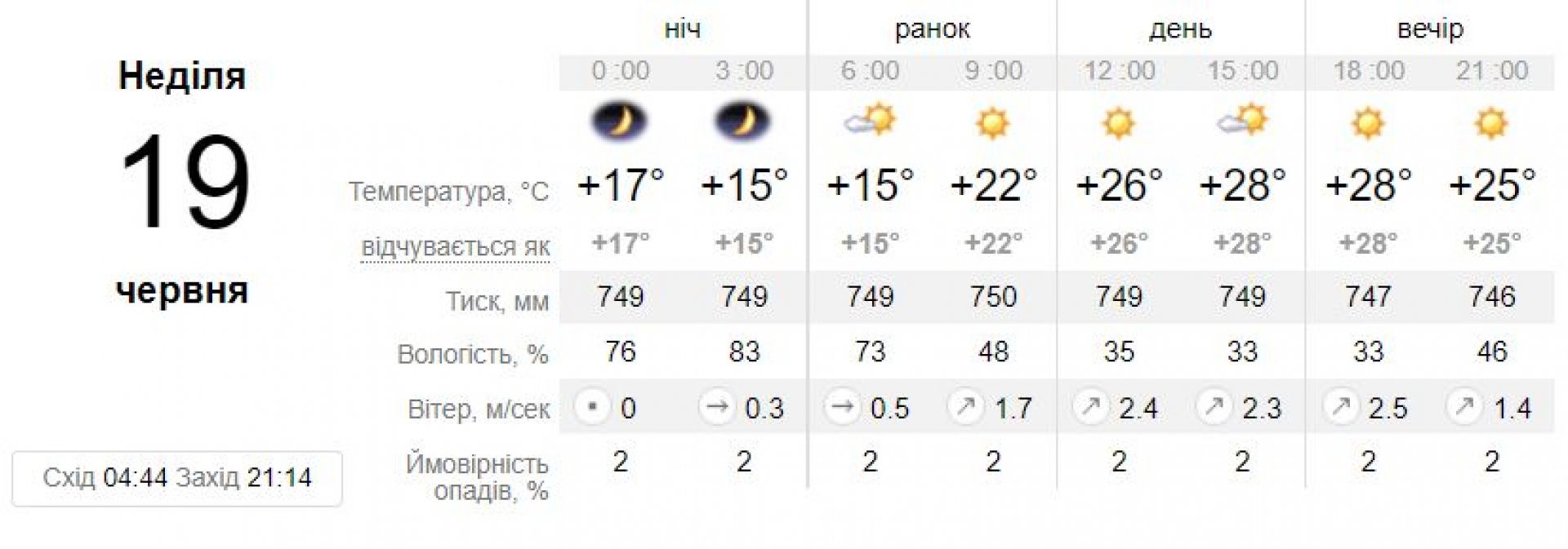 Щодо опадів. 19 червня в Україні діятиме антициклон. Дощів не прогнозують, буде сухо й сонячно.
