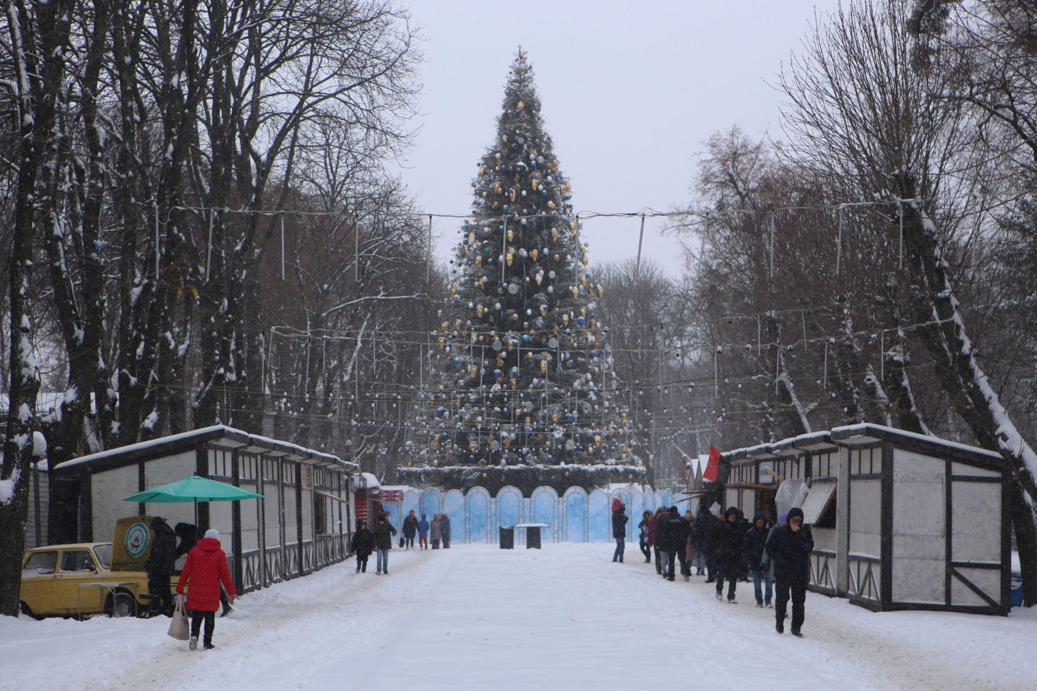 Вдень нікому немає діла до головної святкової прикраси Вінниці — ялинки. Навколо неї майже немає людей.