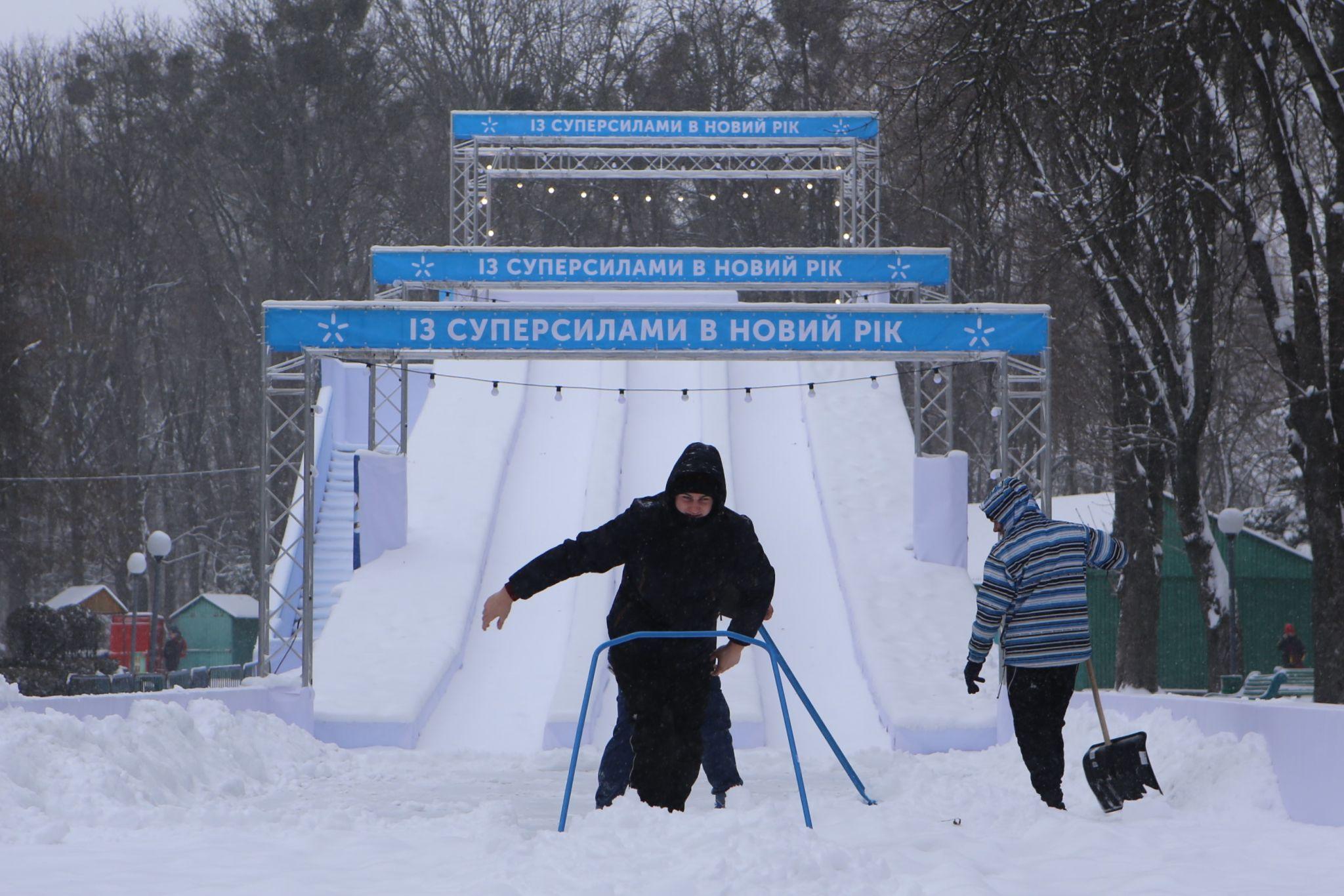 Напис на сноутюбінговій гірці: «Із суперсилами в Новий рік». У гірку нападало стільки снігу, що суперсили цим хлопцям точно не завадять.