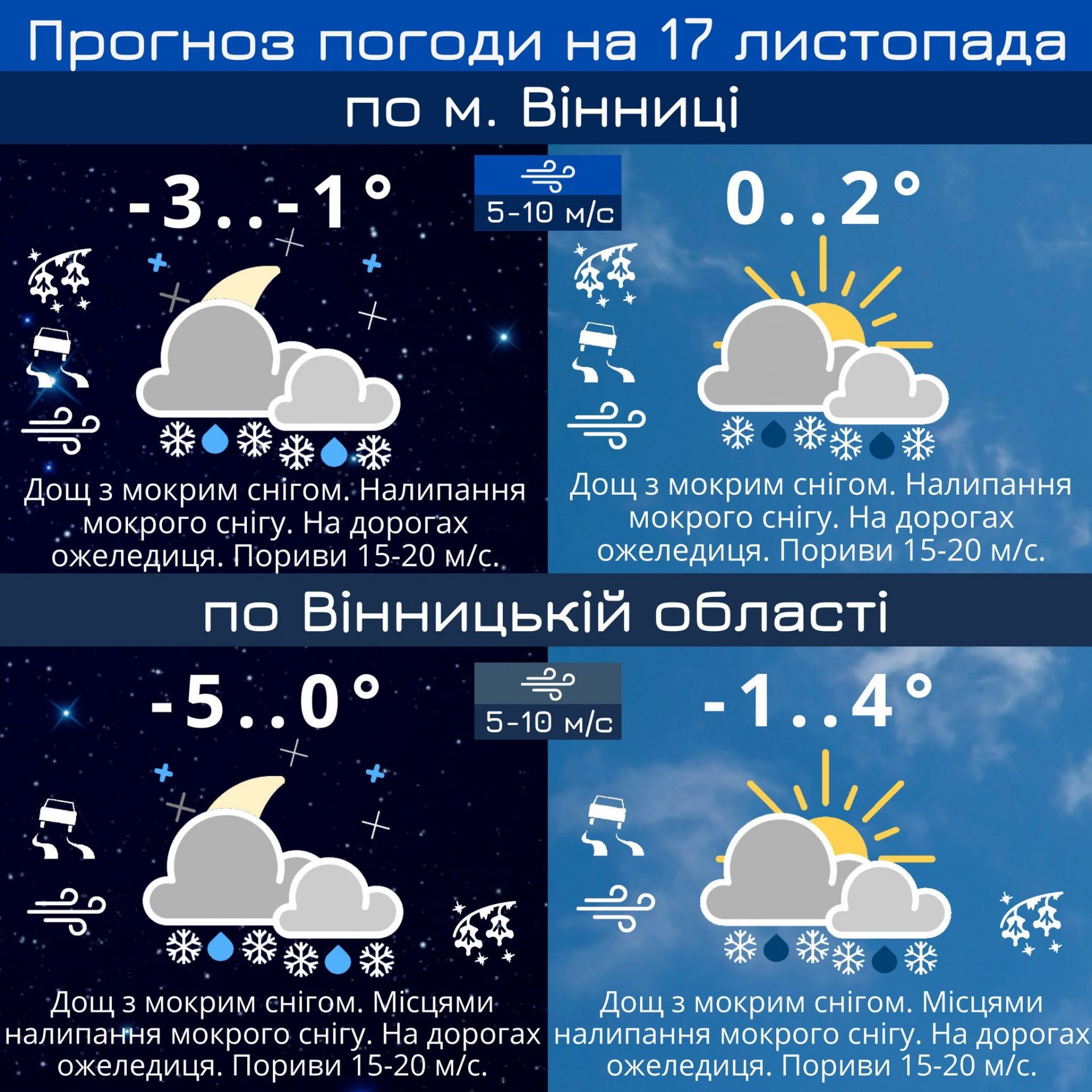 У Вінниці 17 листопада очікується хмарна з проясненнями погода. Дощ з мокрим снігом. Налипання мокрого снігу. На дорогах ожеледиця.
