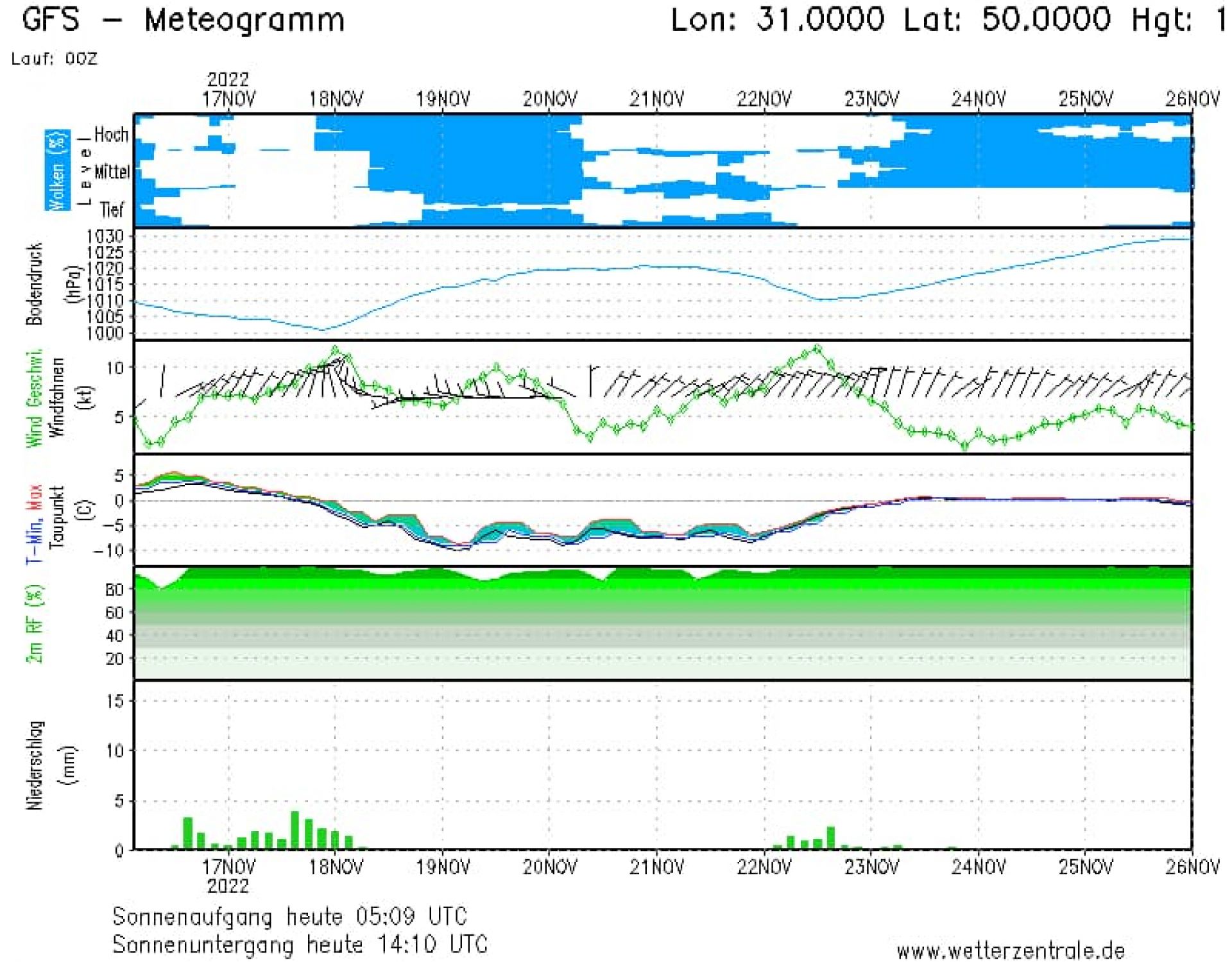 - 18 листопада: хмарно з проясненнями. Невеликий сніг. Місцями ожеледиця. Вітер 5-10 м/с. Температура: вночі 2-7° морозу, вдень від 4° морозу до 1° тепла.