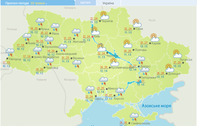 У Вінниці 16 травня синоптики прогнозують короткочасні дощі та грози. Вночі в місті від +11 до +13 градусів, вдень від +21 до + 23 градусів.