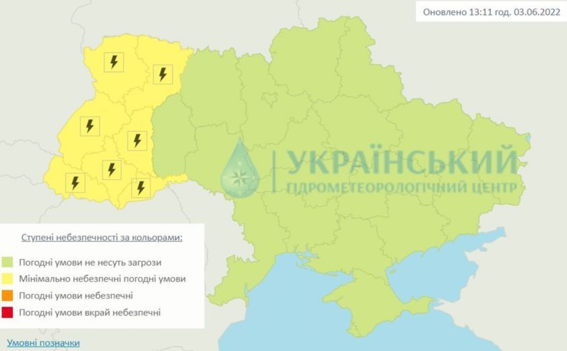 Також Укргідрометцентр оголосив І рівень небезпечності (жовтий) на заході країни.