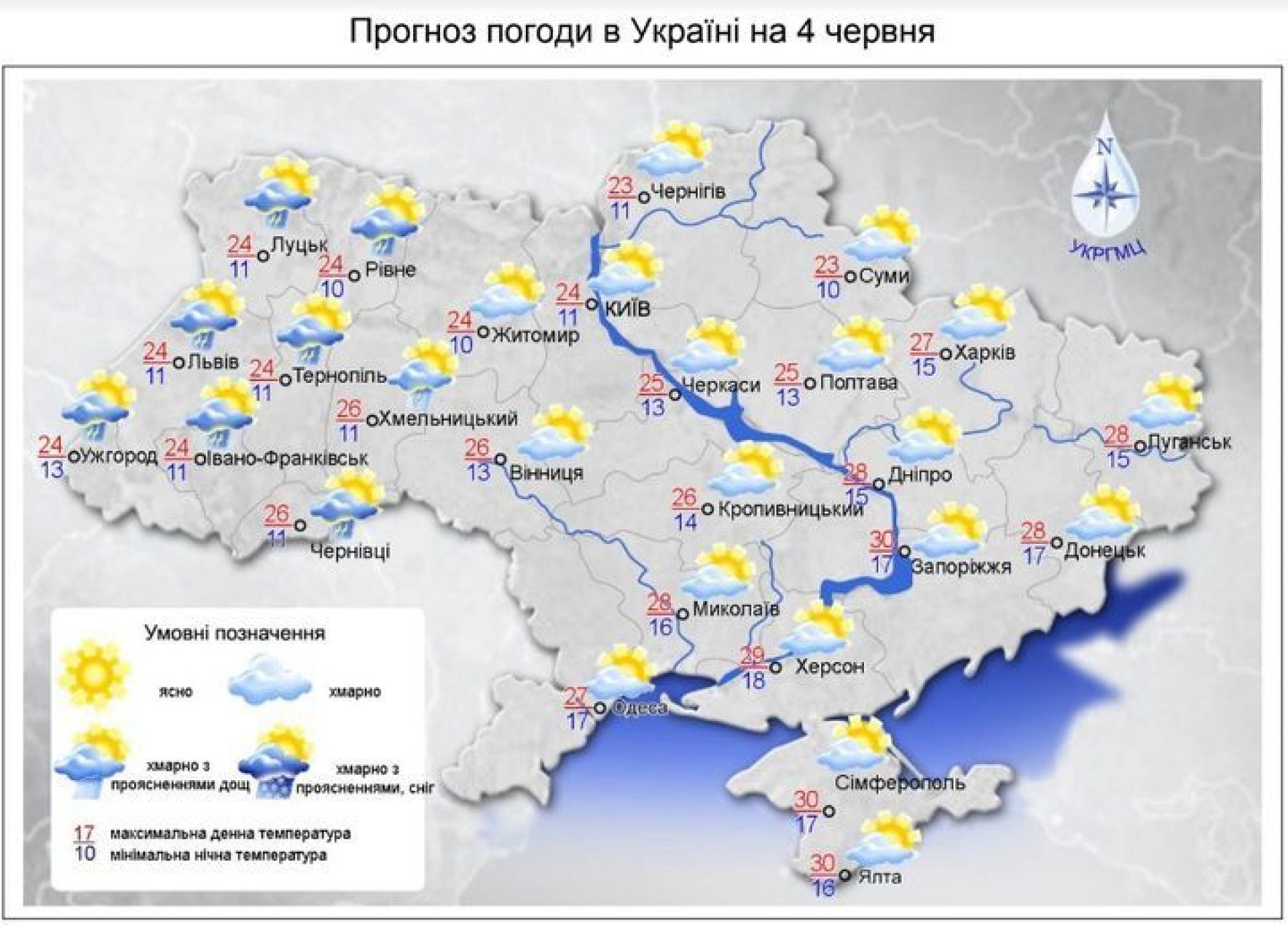 4 червня. Буде +24+31 градус. Очікуються дощі з грозами на Заході. Решта території — сухо.