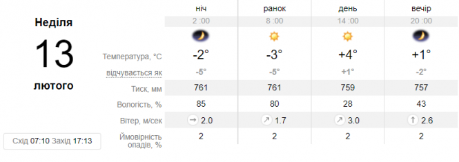 У неділю температура буде -3°...+4°, ясно і безхмарно.