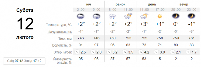 Щодо опадів. Дощі очікуються цієї ночі та вранці суботи. Вдень 12 лютого мокрий сніг пройде лише в східних областях. Решта території — сухо. Також без опадів буде 13 лютого.