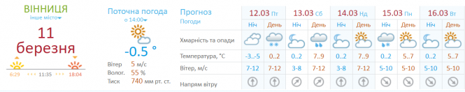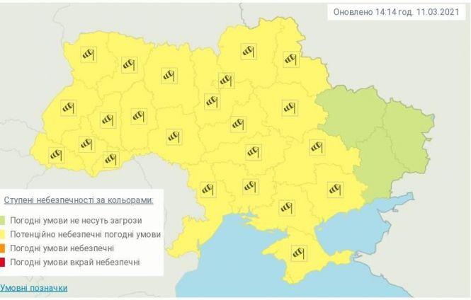«12 березня вночі у західній частині, вранці та вдень в Україні, крім східних областей, пориви вітру 15-20 м/с, на дорогах країни, крім південного сходу, ожеледиця; в Карпатах пориви вітру 25-30 м/с, хуртовина, вночі значний сніг (I рівень небезпечності, жовтий), — йдеться у повідомленні.