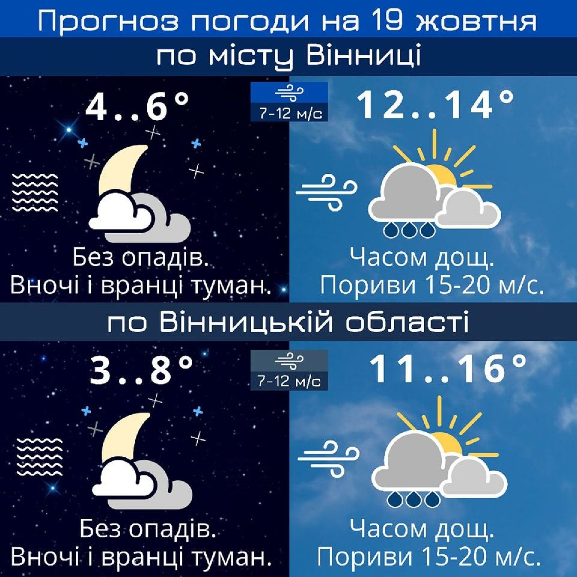 Вінницький обласний центр з гідрометеорології у Вінниці на 19 жовтня прогнозує вдень часом дощ. Вночі та вранці туман. Вітер 7-12 м/с, вдень пориви 15-20 м/с. Температура вночі 4-6° тепла, вдень 12-14° тепла.