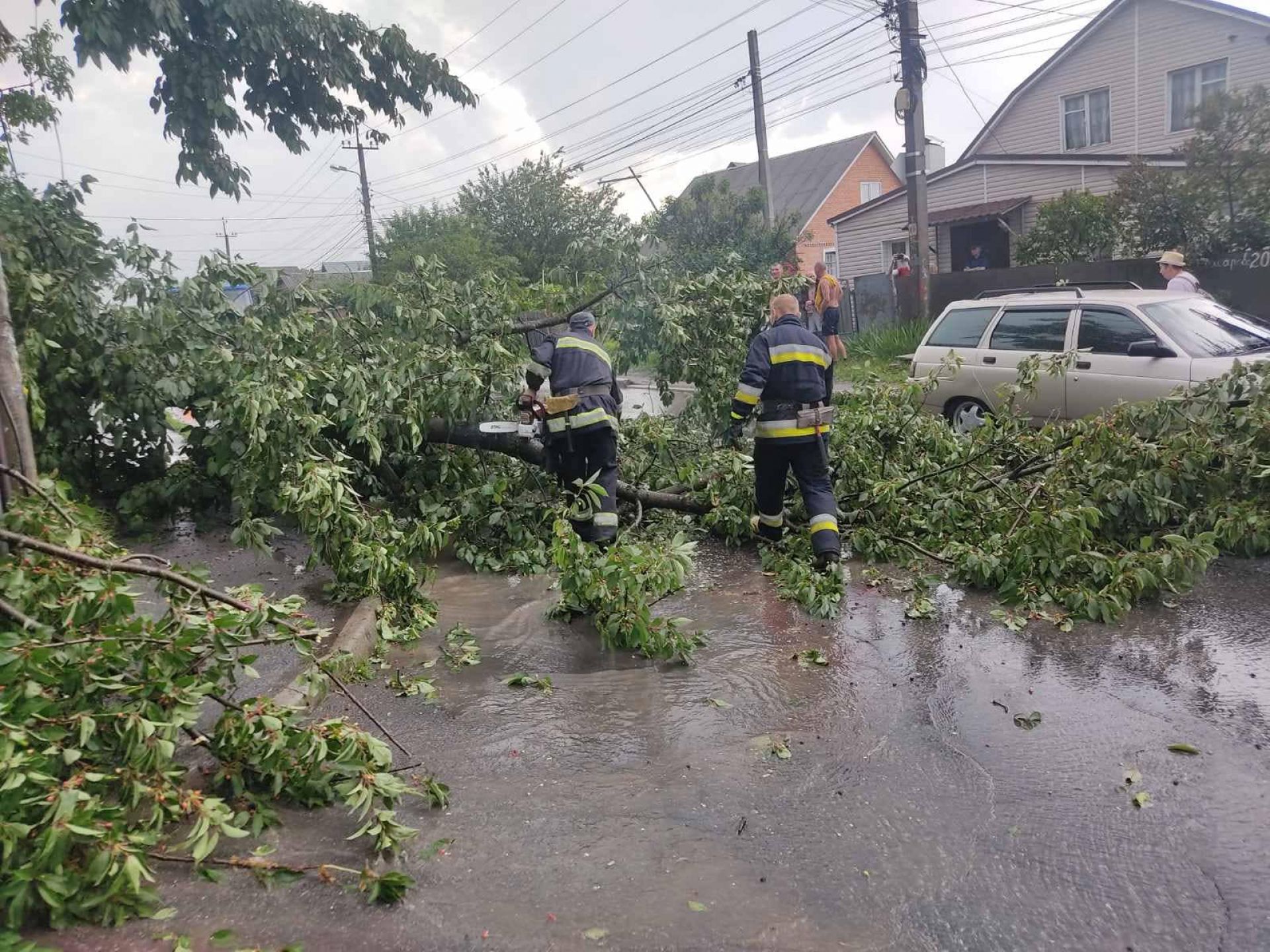 - Минулої доби у Вінниці лив сильний дощ. У деяких мікрорайонах також випав град. Вистачало роботи і рятувальникам, які виїжджали прибирати повалене гілля.