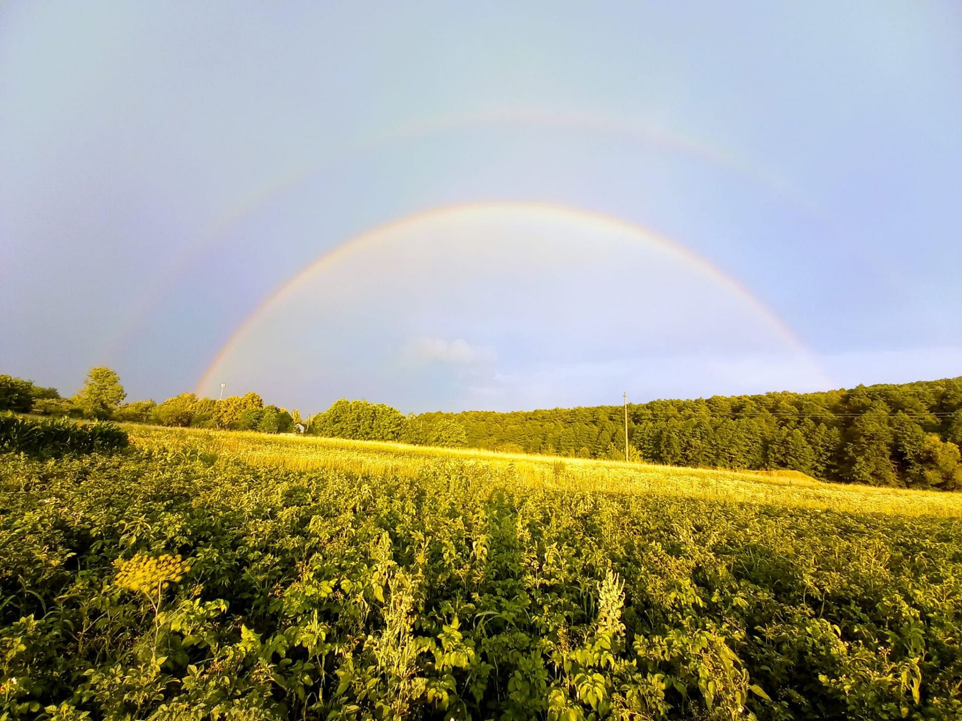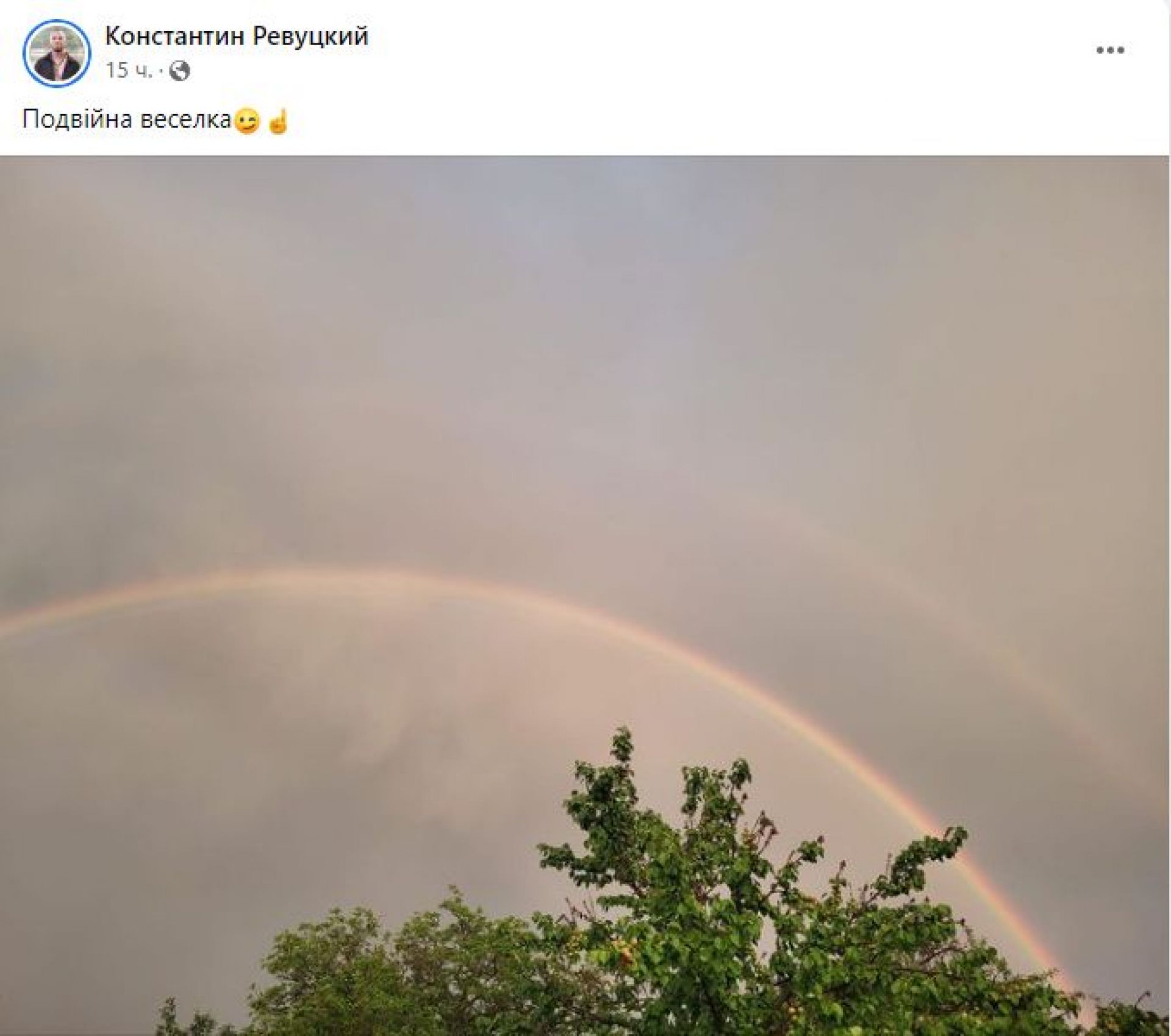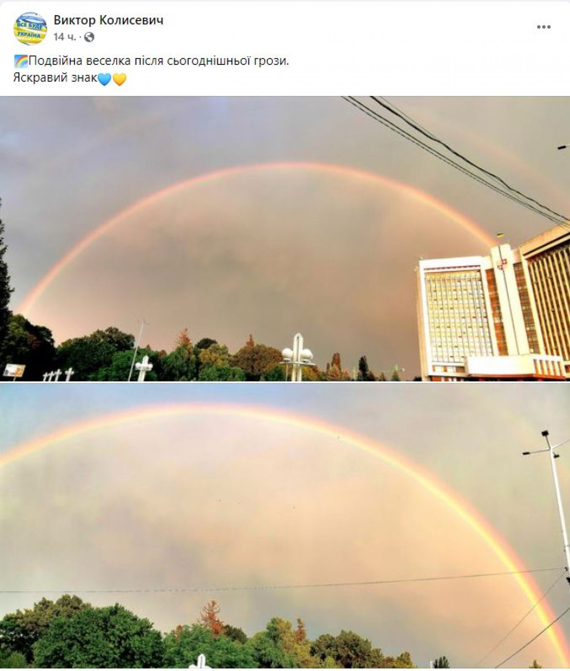 — Яскрава подвійна веселка над рідною селом, над рідним краєм...Милувався нею, спостерігав за блискавками і слухав відлуння грому та просив Господа Бога про те, щоб уся Україна якомога швидше чула лише відлуння грому, а не вибухи кацапських ракет та авіабомб, — написав Юрій Мельник. — Боже, врятуй Україну, врятуй Європу, врятуй світ, дай нам сили якомога швидше здолати московську нечисть...Вірю — Україна переможе. Слава Україні!