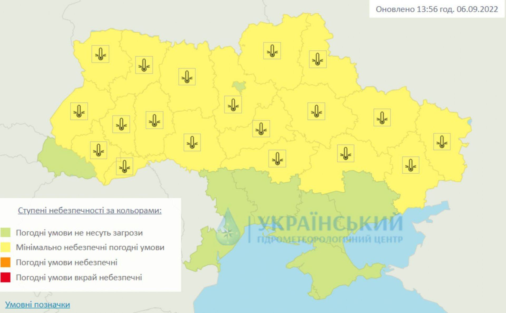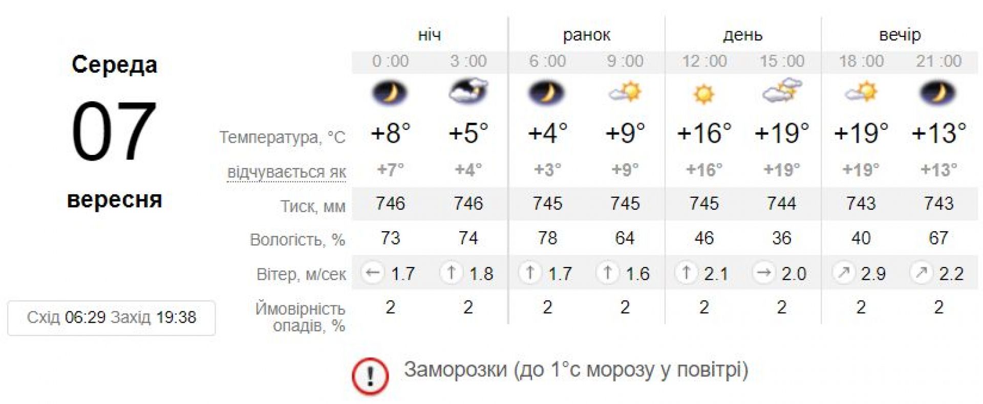 — Вночі 7 вересня в Україні, крім Закарпаття та південної частини, заморозки на поверхні ґрунту 0-5°, — йдеться у повідомленні. — I рівень небезпечності, жовтий.