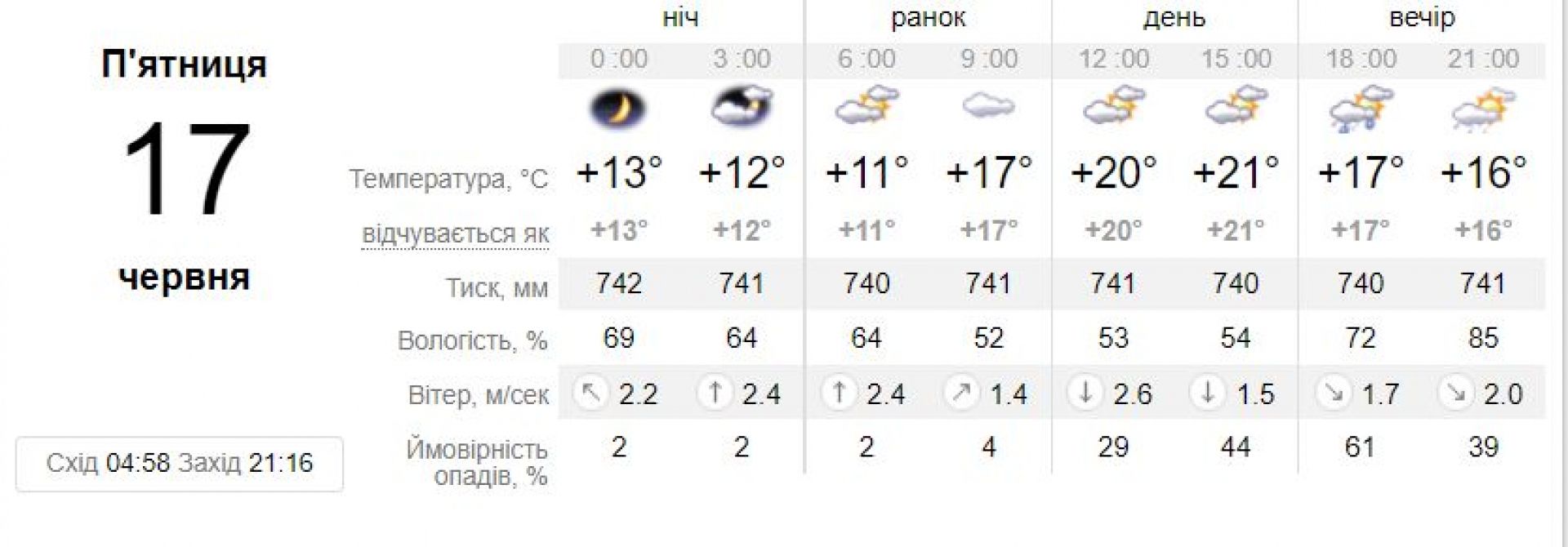 — Температура повітря 17-го червня у більшості наших областей становитиме впродовж дня +20+27 градусів, а в західних областях могло б бути й тепліше, очікується +17+22 градуси, — зазначає у фейсбук Діденко. — Вітер не сильний, північно-західного напрямку.