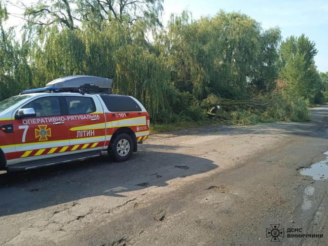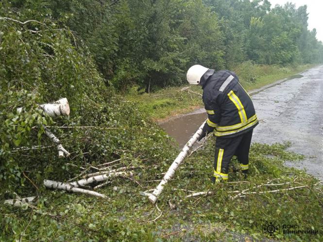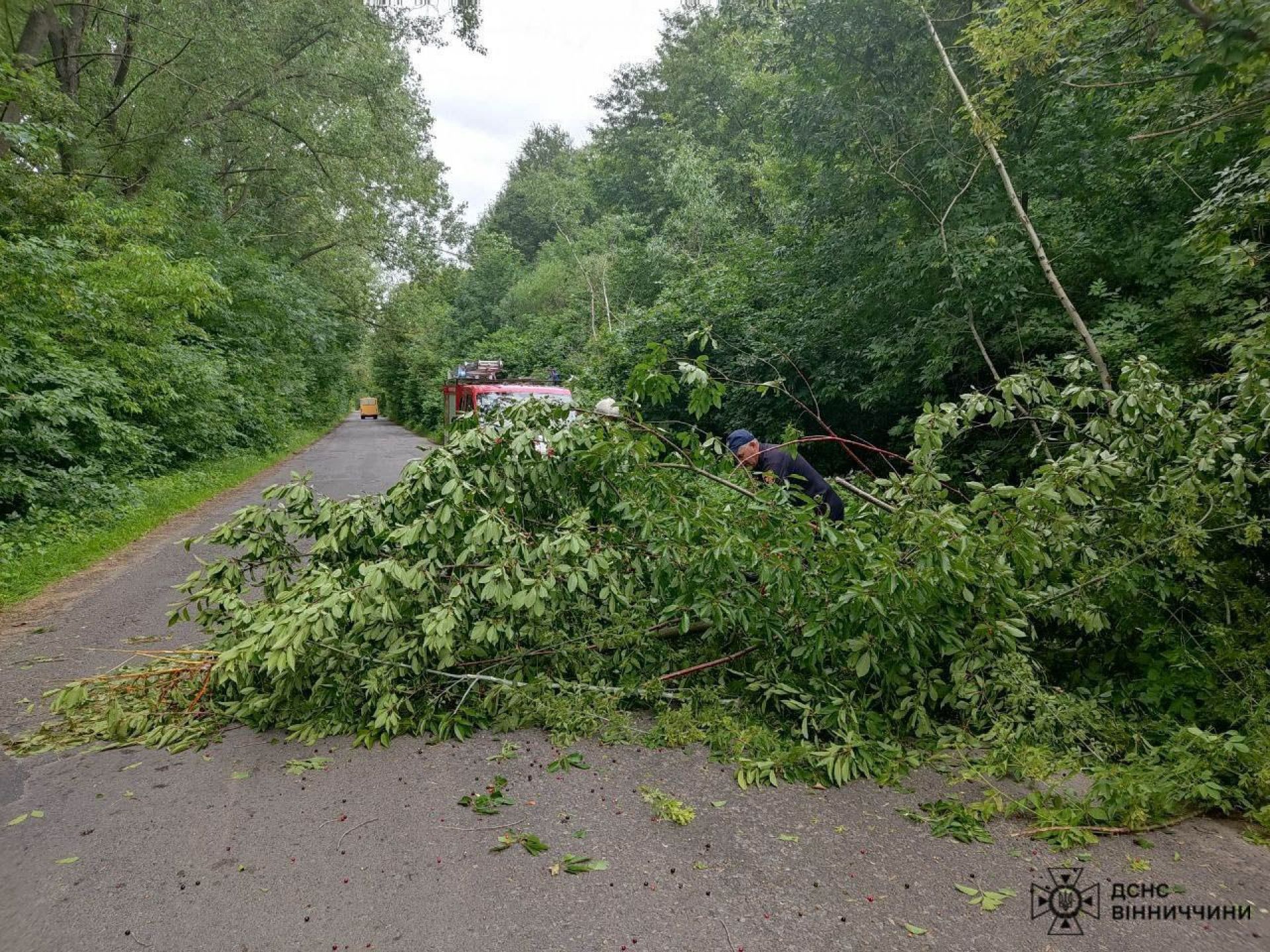 Також дерева падали на автошляху М-30 Краснопільської громади Гайсинського району, за межами села Кожухів Вінницького району та на вулиці Привокзальній у Вінниці.