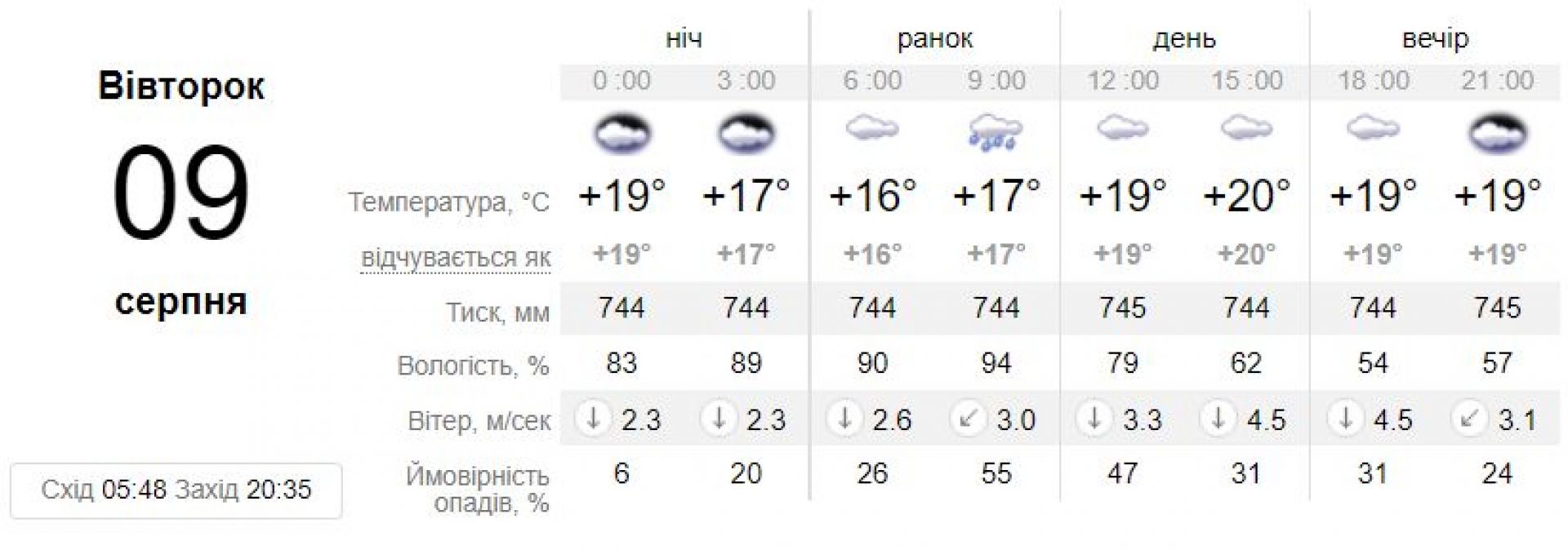 Сайт sinoptik.ua у Вінниці прогнозує на 9 серпня дощі та хмарну погоду. Максимальна температура сягатиме позначки у +20 градусів.