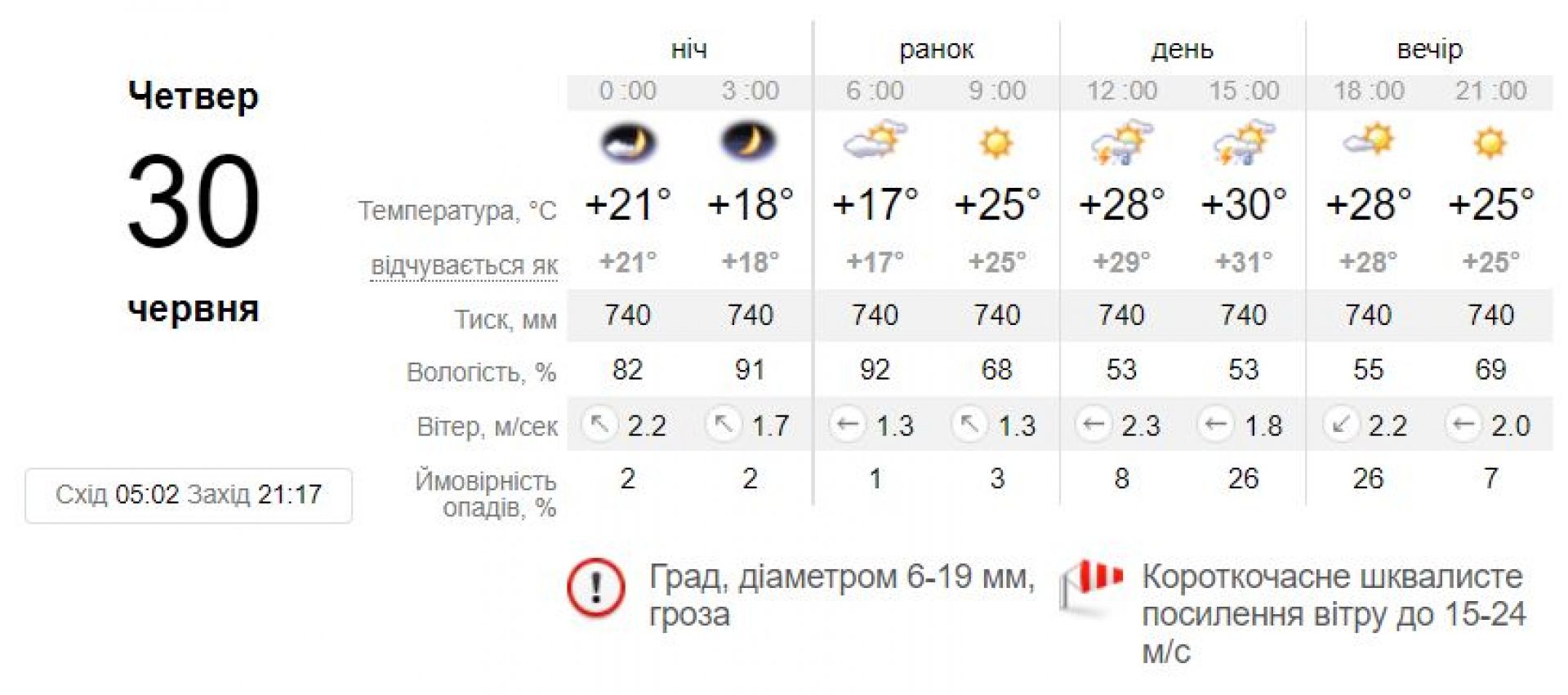 — 30 червня в Україні, крім західних і більшості східних областей, грози; у центральних та південних областях в окремих районах град і шквали 15-20 м/с (І рівень небезпечності, жовтий), — цитуємо повідомлення.