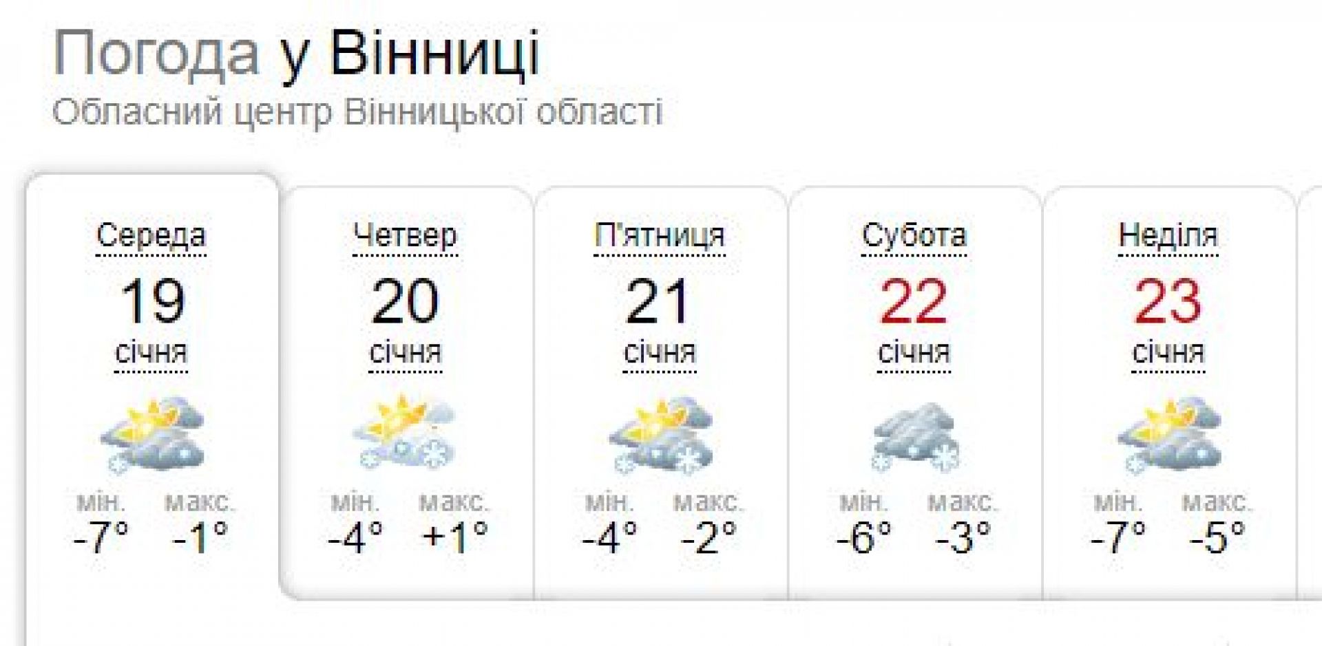 У Вінниці денна температура становитиме від 1 до 3 градусів зі знаком мінус, уночі буде до 5 градусів морозу.