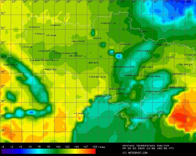 На вихідних, 28 та 29 березня, у Вінниці температура повітря прогріється до +14…+16°. На більшості території України буде ще доволі тепло. Дещо прохолодніше очікується на сході — Харківська, Сумська та Полтавська області прогнозують +8…+11°. Дощі поки що можливі лише місцями на сході, решта регіонів залишиться переважно сухою.