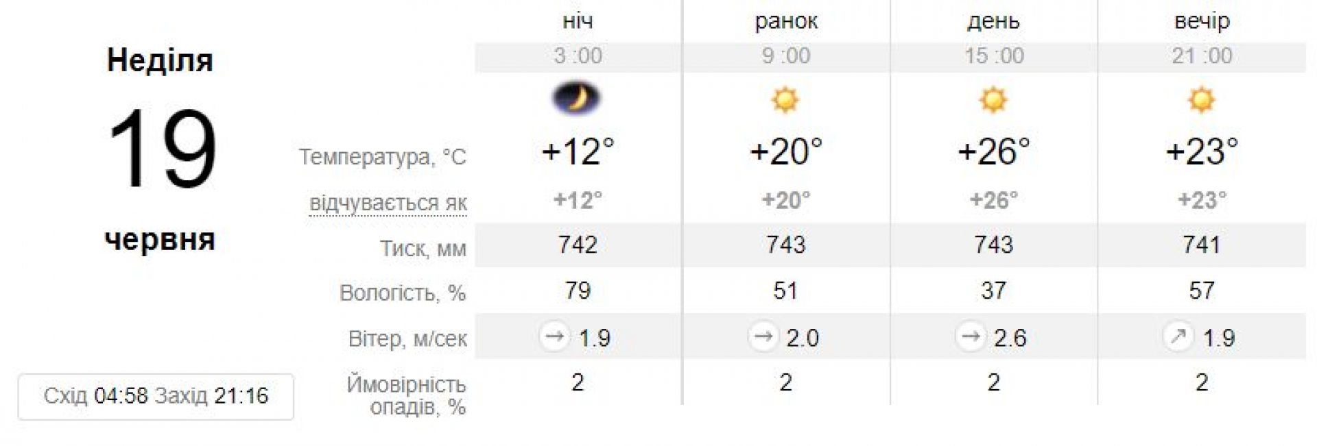 Неділя. 19 червня очікується до +30+32 градусів. Без опадів.