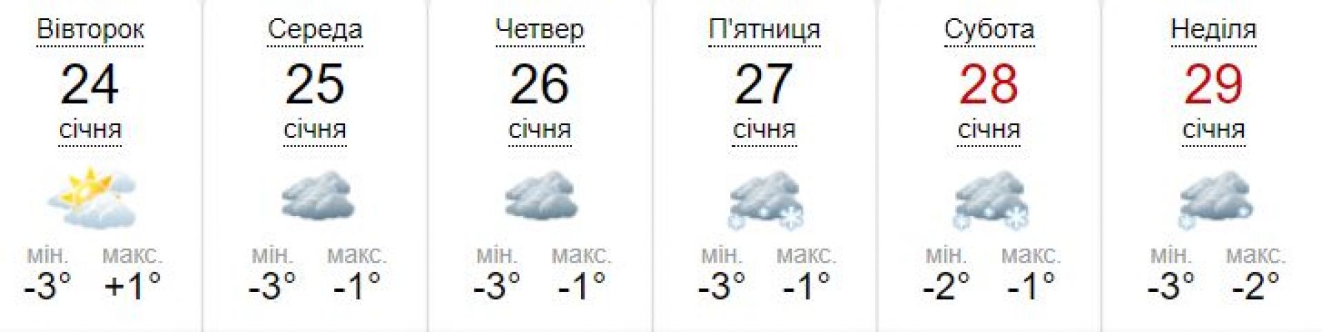 - 25-26 січня: хмарно з проясненнями. Без істотних опадів. Вітер: 5-10 м/с. Температура вночі 3-8° морозу, вдень від 3° морозу до 2° тепла.