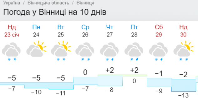 За прогнозом синоптиків, у ніч на понеділок, стовпчики термометрів у Вінниці впадуть до 10 градусів морозу, і вдень 24 січня погода буде морозною. Вже вранці температура опуститься до 8 градусів морозу, у другій половині дня у понеділок розпочнеться сніг із подальшим зниженням температури.