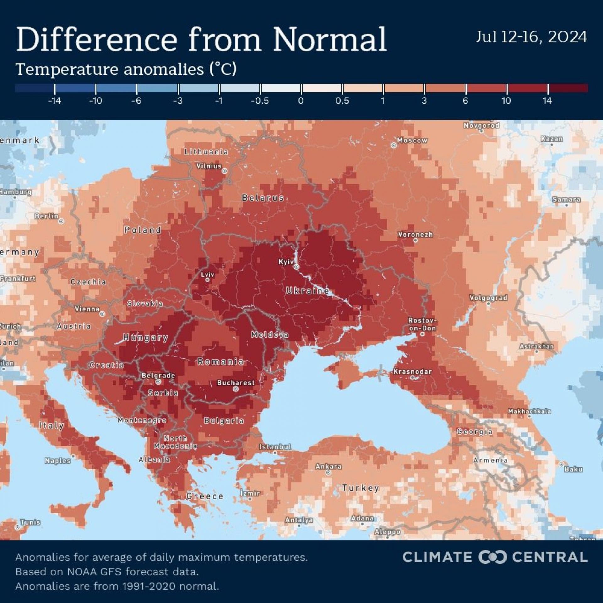 — На картинках видно, що з 12 по 16 липня в Україні переважає CSI 4-5 рівня. Це значить, що саме в цей час ми можемо очікувати нових температурних рекордів, які будуть близькими до абсолютних максимумів. І згідно з CSI, ці рекорди з високою ймовірністю зумовлені саме зміною клімату, — кажуть в Українському гідрометеорологічному центрі.