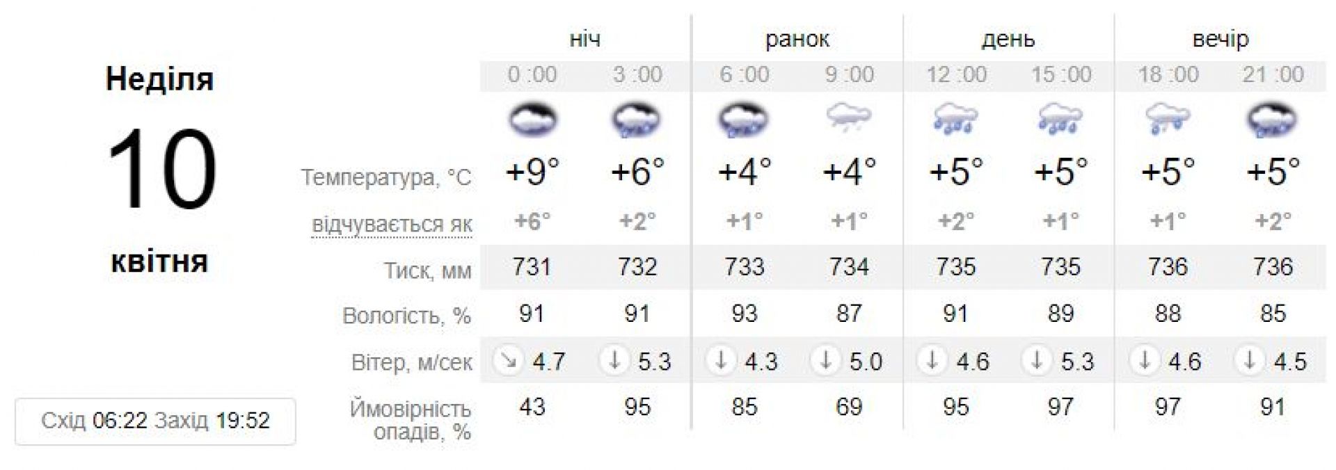 Щодо опадів. Дощі 10-го квітня пройдуть у центральних областях, на Півночі, місцями в західній частині та подекуди на Одещині. Місцями можливий мокрий сніг.